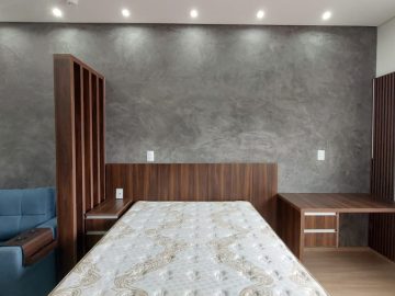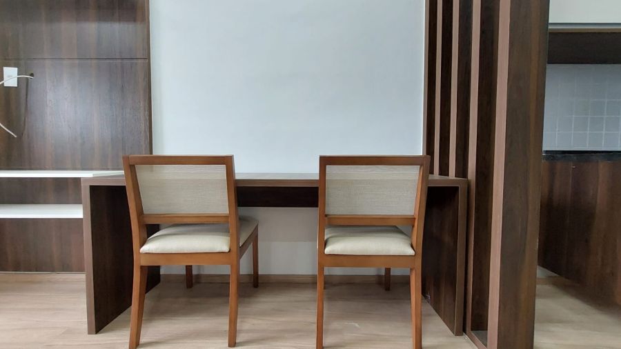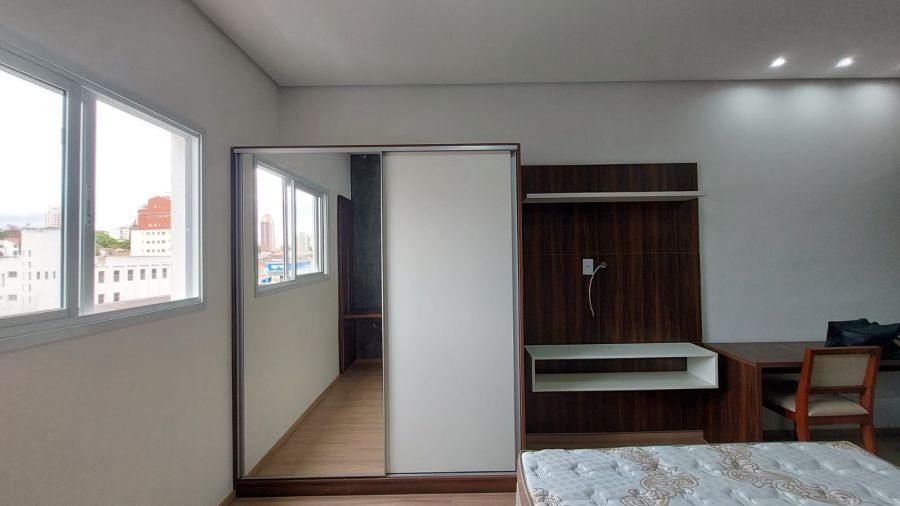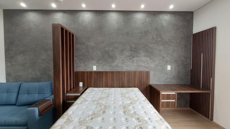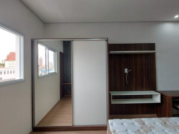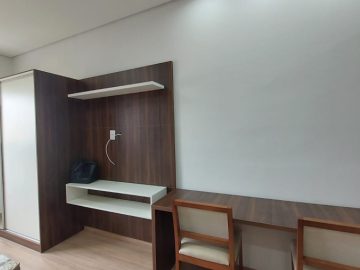 Cama box de casal, criado mudo, guarda roupa embutido, sofá, ar condicionado com controle remoto, rack com TV smart instalado e controle remoto, mesa retangular instalado com 2 poltronas, cooktop por indução, geladeira, air fryer, microondas, pia, armário aéreo e gabinete de cozinha e banheiro instalado, chuveiro a gás, espelho.